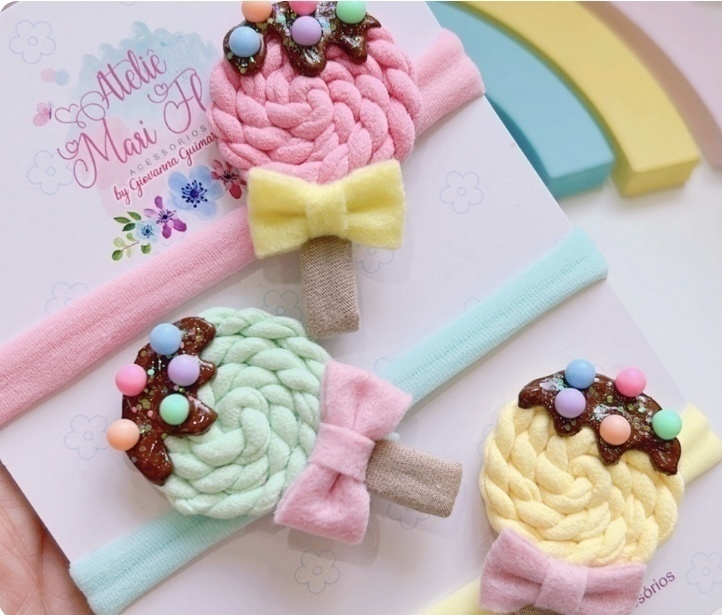 Prepare-se para uma explosão de fofura com a Faixinha Pirulito com Calda! Essa delicada faixinha é feita em fio de malha e tem uma aplicação de pirulito todo estiloso, com uma caldinha de chocolate e confeitos coloridos que vão deixar qualquer bebê irresistível!
