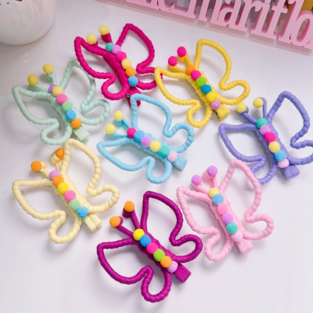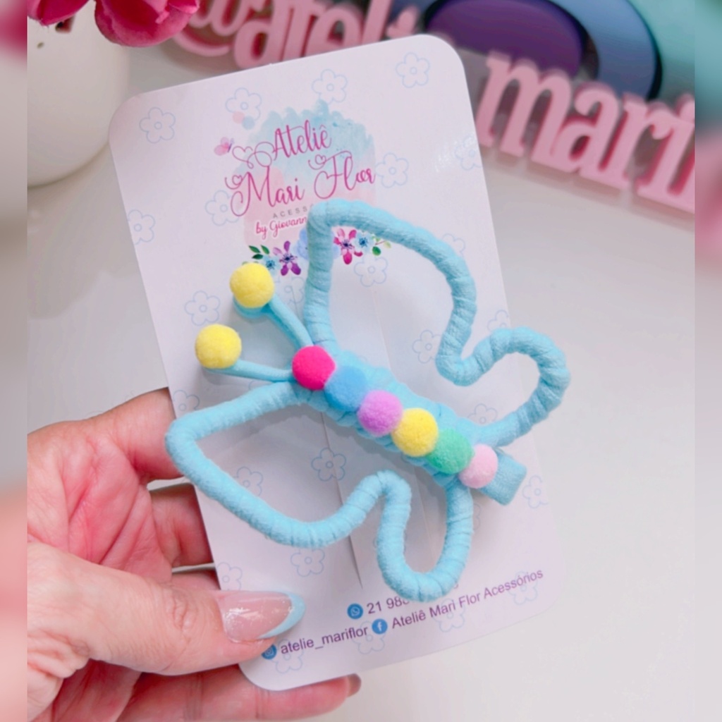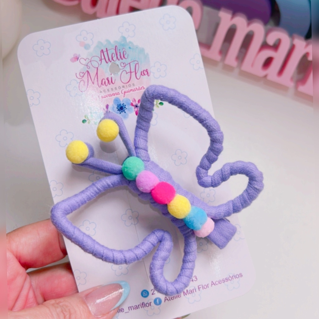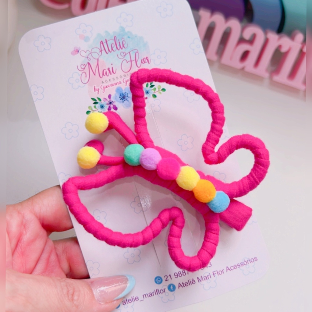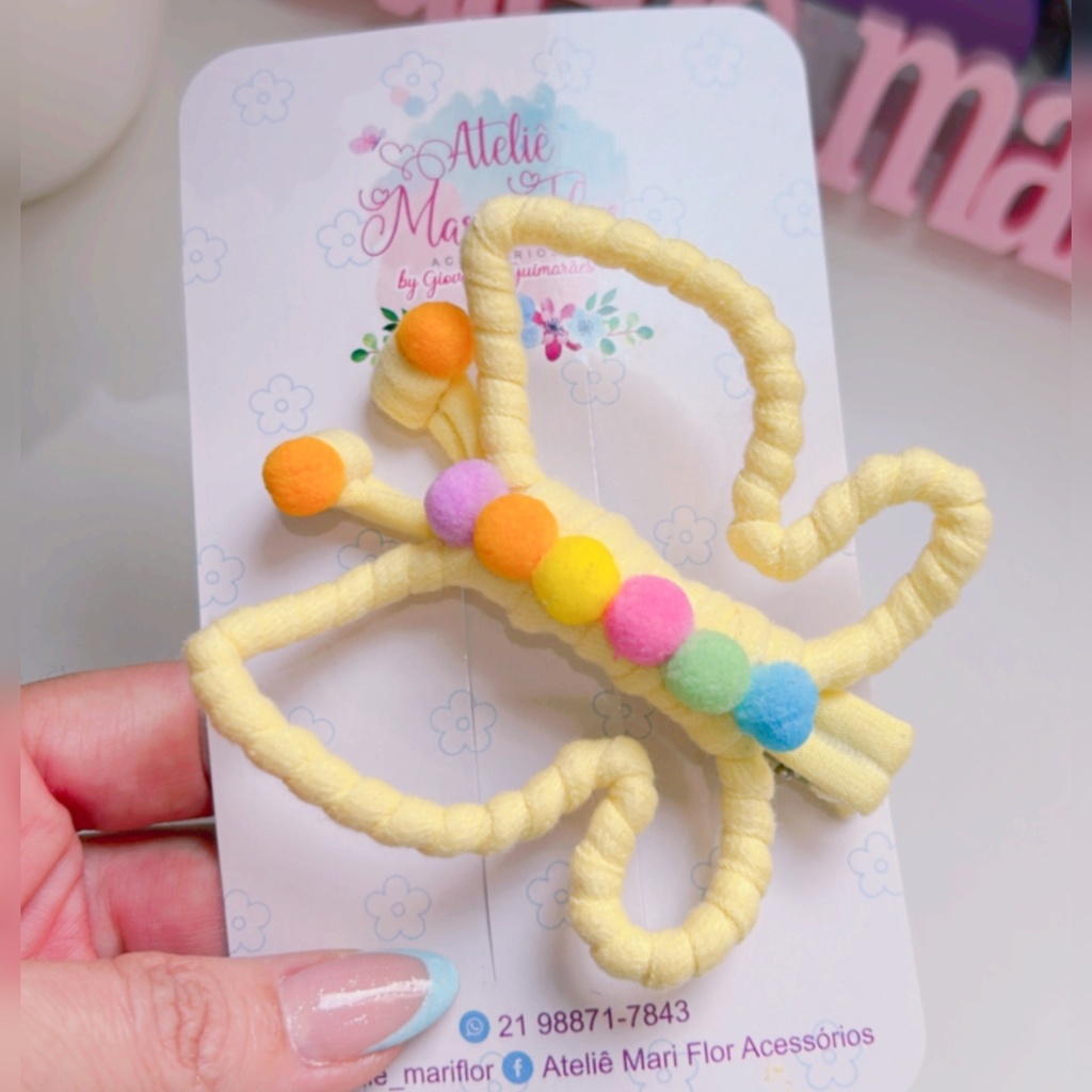 🦋 Prepare-se para voar alto com a Presilha Borboleta Giovanna! Toda forrada em fio de malha e decorada com pompons coloridos, essa presilha é a definição de fofura e diversão!