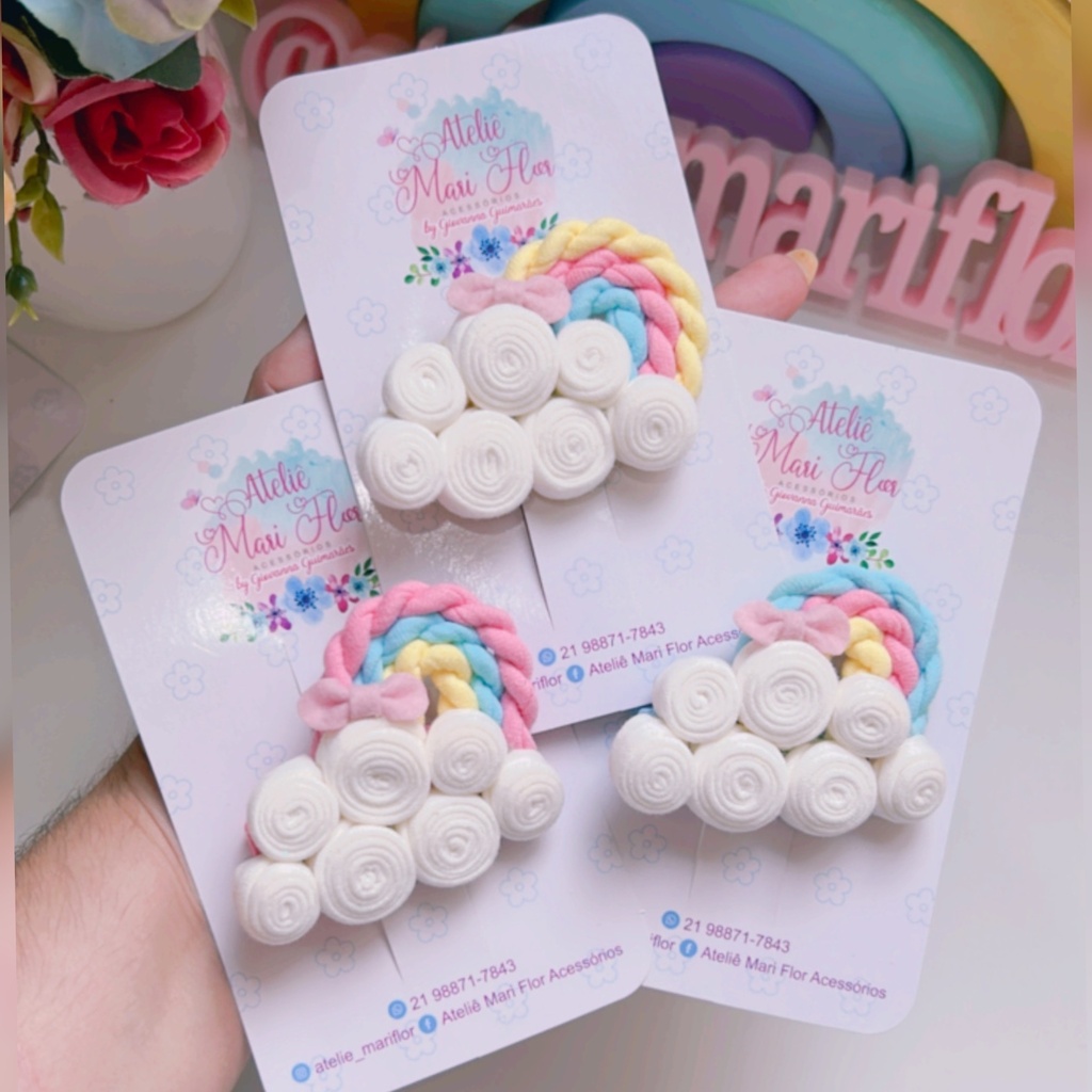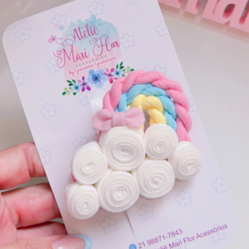 PRESILHA NUVEM: O TOQUE DIVERTIDO QUE FALTAVA NO SEU LOOK! ☁️🌈 Prepare-se para arrasar com a Linda Presilha em Forma de Nuvem! Com um arco-íris todo em fio de malha, essa presilha é perfeita para dar aquele up no visual!